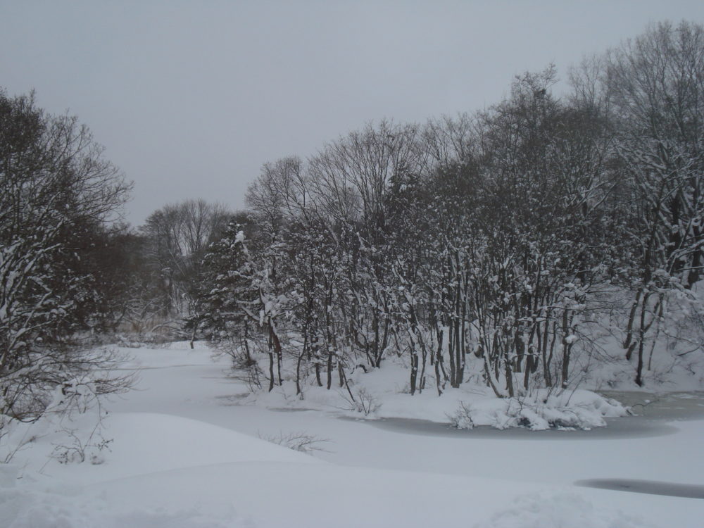 下の写真は、うちの庭にある沼と林です。木々についた雪がきれいでしょ?!