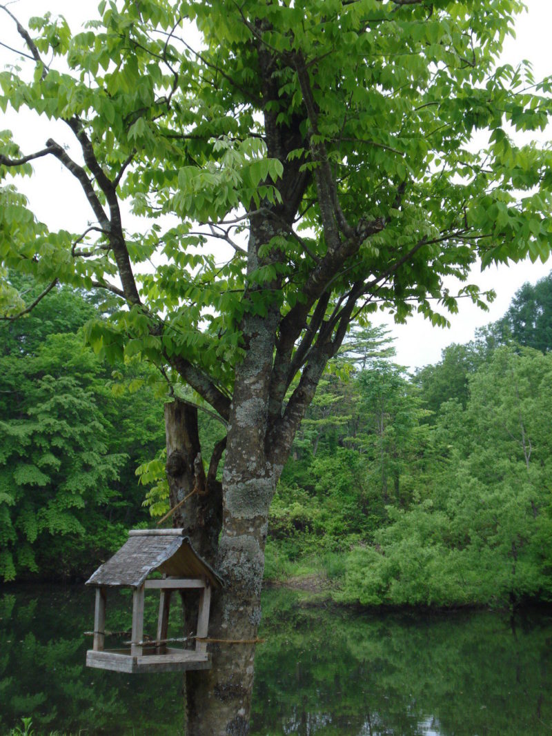 庭の槐(えんじゅ)の木も葉が伸びてきて、鳥のエサ箱を置いてみました。いろんな鳥が来ますが、エサを食べに来てくれるといいんだけど・・・