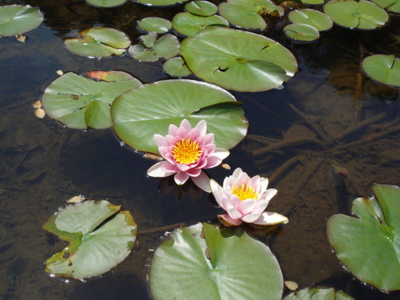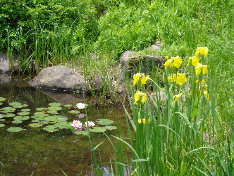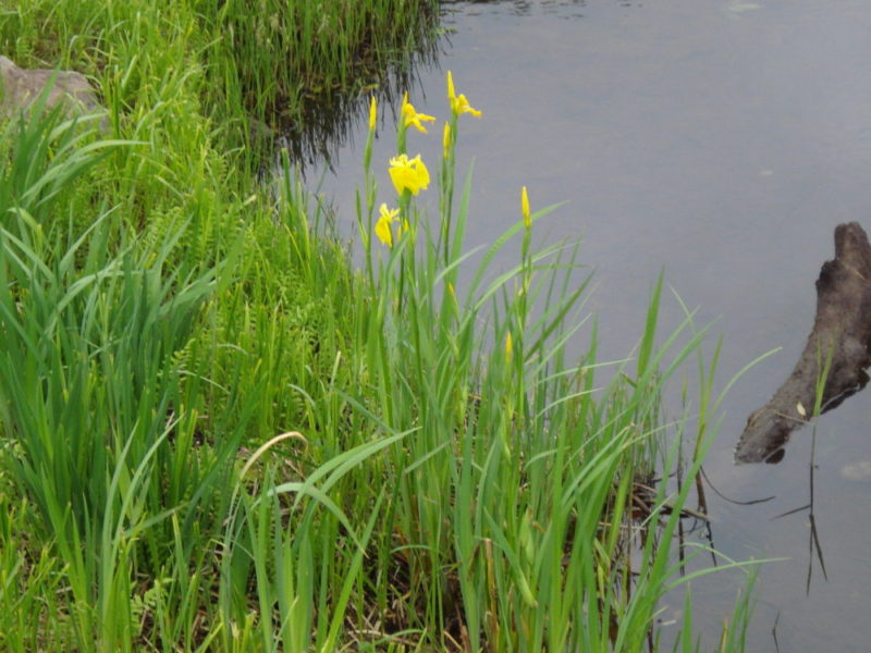水辺に植えた、かきつばた?花ショウブ?とスイレンが咲いていました。