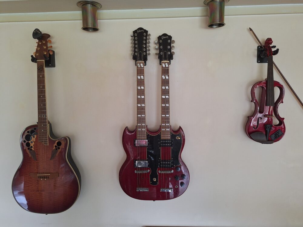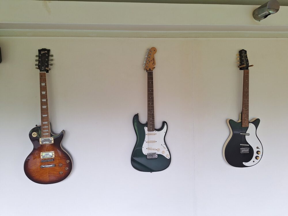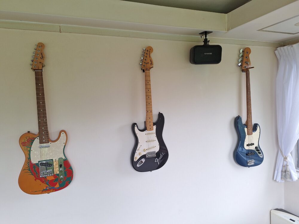 最初は絵画を飾っていましたが、南側なので灼けてしまいギターを飾っています。